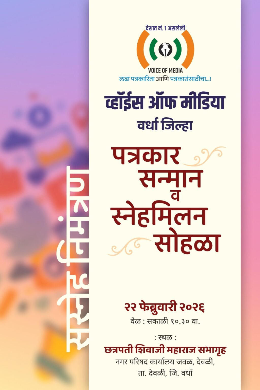 वर्ध्यात पत्रकारांचा गौरव होणार! २२ फेब्रुवारीला देवळी येथे ‘व्हॉइस ऑफ मीडिया’चा भव्य पत्रकार सन्मान व स्नेहमिलन सोहळा